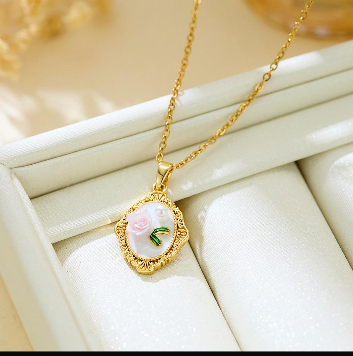 Add a touch of vintage romance to your jewelry collection with this Victorian Rose Oval Inlay Necklace. Featuring a delicate rose motif on a soft inlay base, framed in an antique-inspired gold finish, this piece blends timeless elegance with modern durability. Designed with an anti-tarnish coating, itโ€™s perfect for everyday grace and special moments alike.